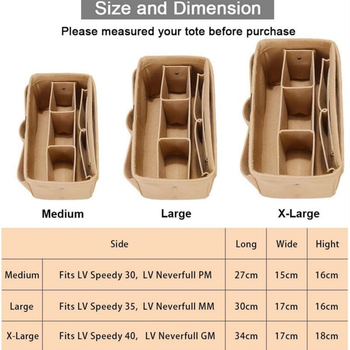 【Size Chart & Fitted Model】3 sizes. Size M 10.63 x 5.91 x 6.3 for Speedy 30; Size L 11.81 x 6.7 x 6.3 for Speedy 35 & Neverfull MM; Size XL 13.4 x 6.7 x 7.1 for Speedy 40 & Neverfull GM.Great insert purse for various other brands tote, large handbags, backpacks, suitcases, travel bags, and more. Easy to go out now! Please kindly measure the interior length, width and height of your handbag with a measuring tape. Pls check the size chart before purchasing it!